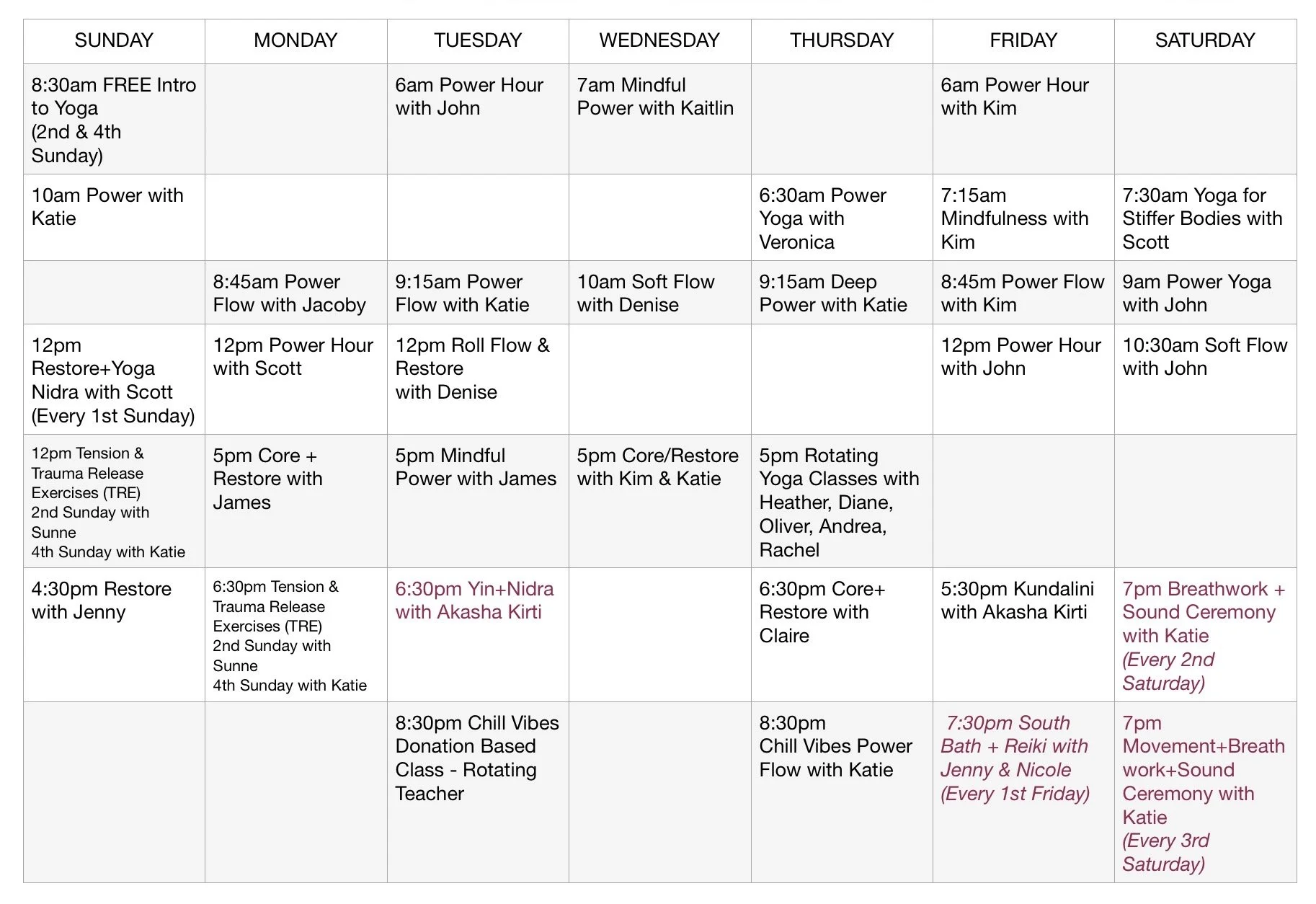 Please click the GOOGLE LINK below for a more accurate day-to-day schedule that will reflect cancellations, substitutions, and holiday closures. Thank you.